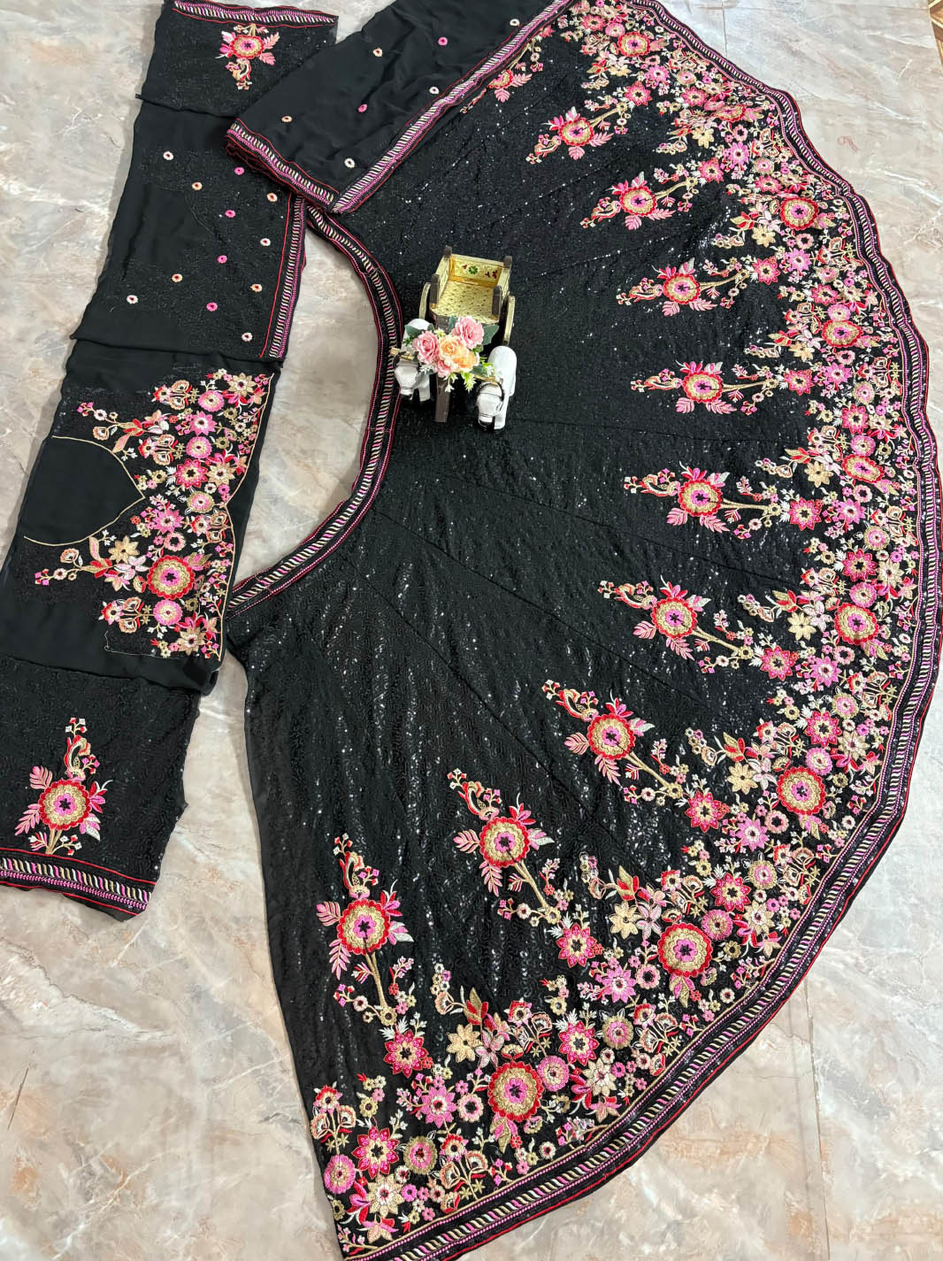 The blouse is made from high-quality Faux Georgette fabric, featuring sequins embroidery work. With 1 meter of unstitched fabric, you can design your favorite lehenga blouse models and customize it as per your style. Completing the lehenga set is a 2.3-meter faux georgette dupatta, beautifully enhanced with sequins embroidery that adds sophistication to the ensemble.