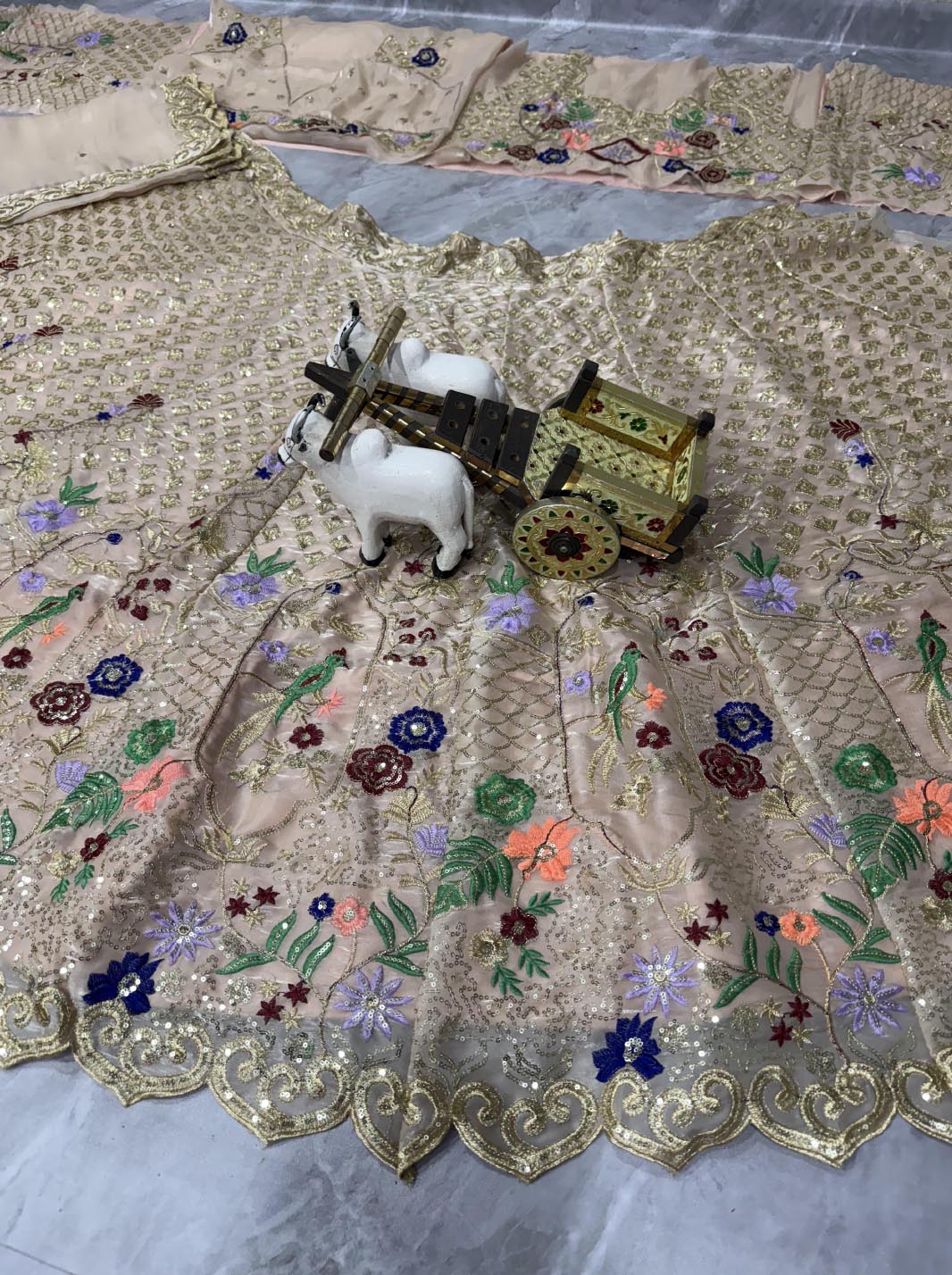 The blouse, made from matching Jimmy Chu fabric, comes with 1.2 meters of unstitched sequins embroidered fabric, allowing you to design your favorite lehenga blouse models. Completing the lehenga set is a 2.3-meter dupatta, also in Jimmy Chu fabric, enhanced with sequins embroidery that adds an elegant finishing touch.
